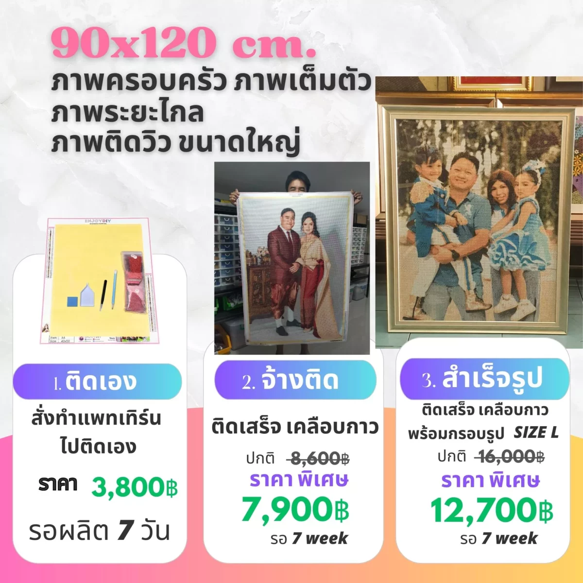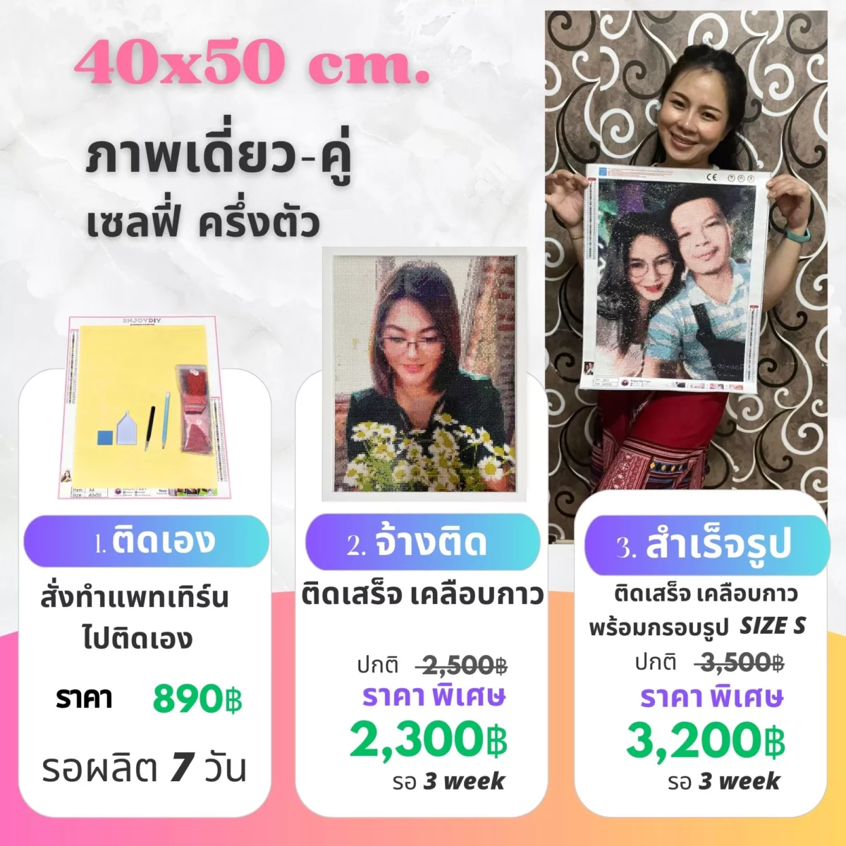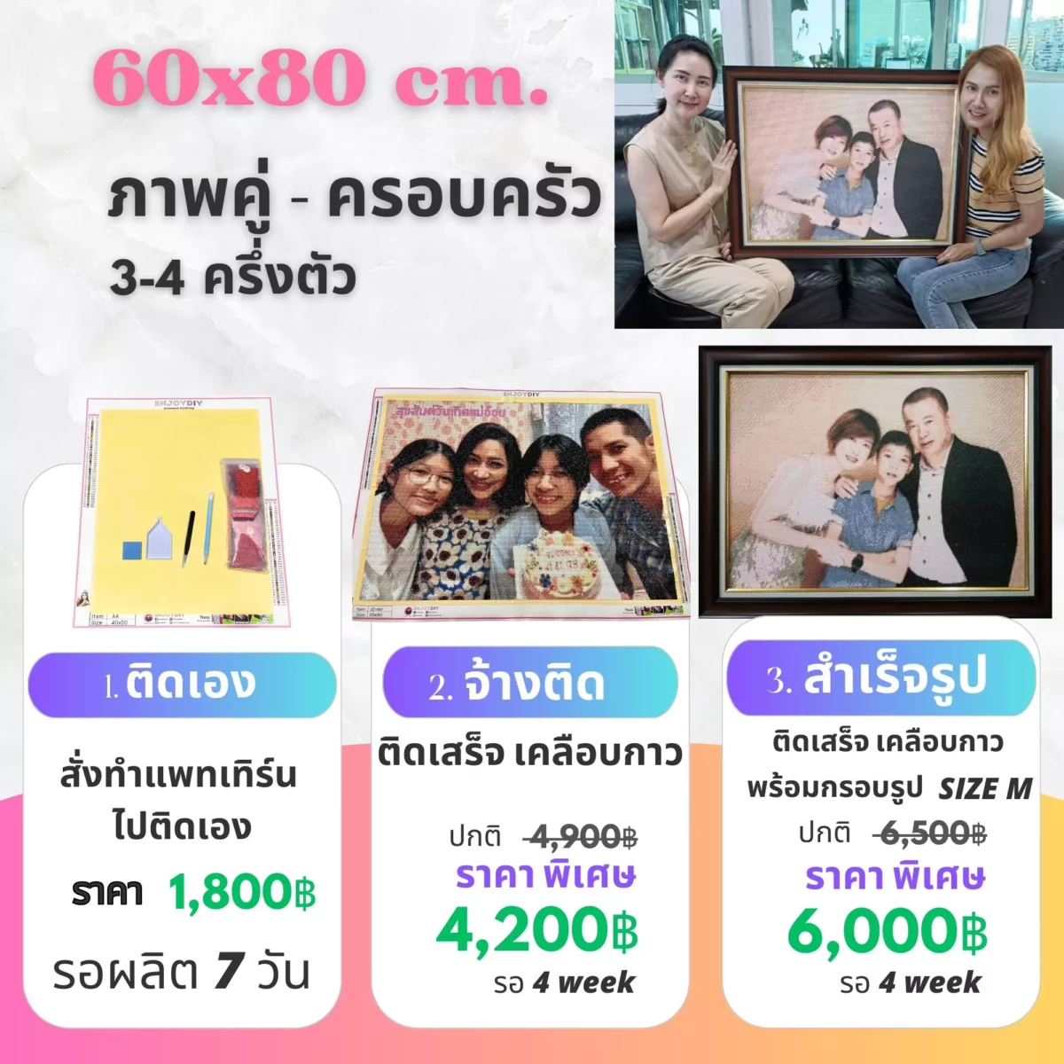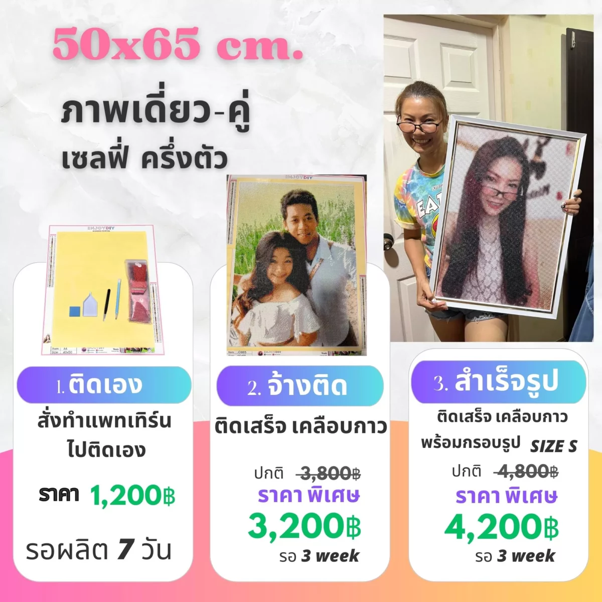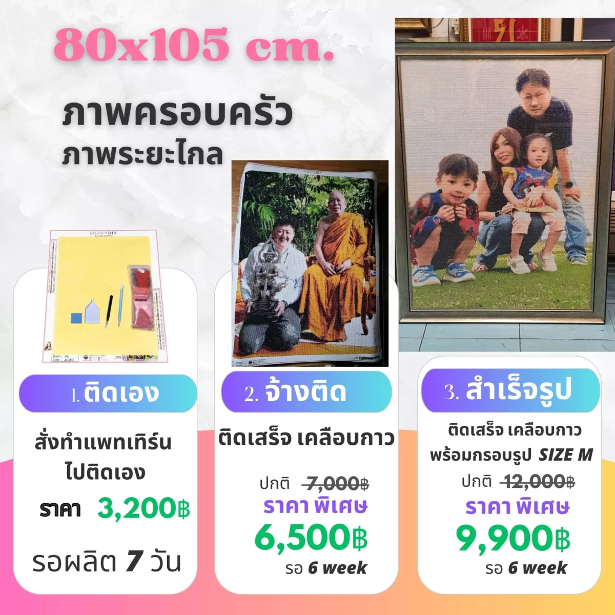 เราไม่หยุดพัฒนาคุณภาพสินค้า เพราะของขวัญชิ้นนี้มีค่าทางจิตใจ เราจึงใส่ใจทุกรายละเอียด เม็ดสีจะแหลมและเงา เป็นประกายทุกเม็ด กาวจะเหนียวติดทน จัดส่งใส่กล่อง/กระบอก อย่างดี สี แพทเทิร์นชัดเจน กระดาษแคนวา อย่างหนา
